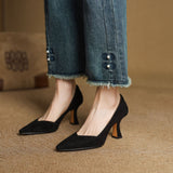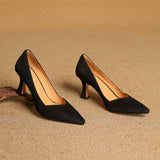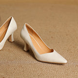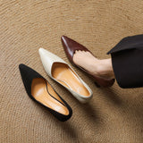 A modern pointed toe pairs with genuine leather and a mid-high curved heel to define these slip-ons, featuring a comfortable insole, perfect for versatile wear.